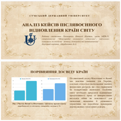 “Analysis of cases of post-war reconstruction of countries of the world”, in which successful examples of post-war reconstruction of states were analyzed. Their comparative analysis was carried out and the main lessons that can be used for the reconstruction of Ukraine were identified. Special attention was paid to the role of international aid, state policy and investment in the restoration processes. The study was carried out within the framework of the research project “Fundamental principles of sustainable and inclusive development of regional space for post-war recovery in the conditions of digital transformation” (No. d/r 0125U001620, 2025-2027).
