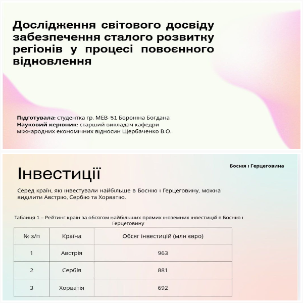 “Research on the world experience of ensuring sustainable development of regions in the process of post-war reconstruction”, where the international experience of restoring regions and ensuring economic stability was considered;