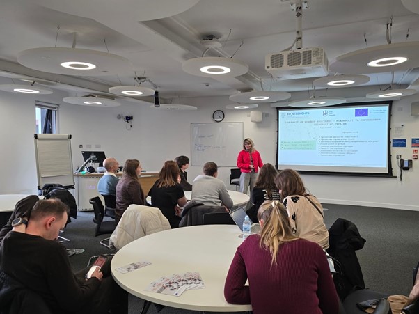 The presentation took place within the framework of an international programme involving representatives of Ukrainian and British universities, research institutions, and organisations working in the fields of science, innovation, and education. During the meetings, the key areas of the EU_STRENGHTS project were presented, including the development of digital competences, strengthening the role of universities in innovation, support for entrepreneurship education, and the expansion of international academic cooperation.