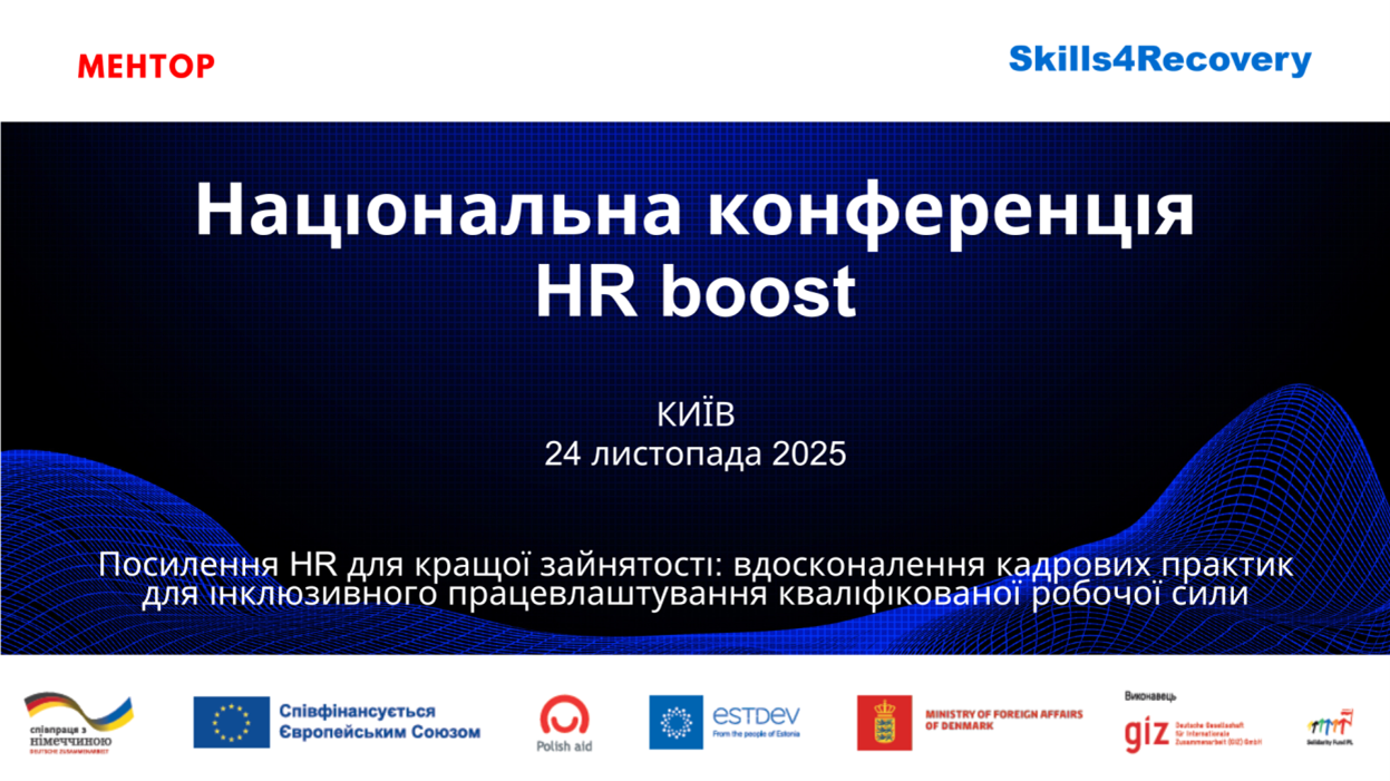 24 листопада 2025 року у Києві відбулася Національна HR-конференція – фінальний захід всеукраїнського Проєкту «Посилення HR для кращої зайнятості: вдосконалення кадрових практик для інклюзивного працевлаштування кваліфікованої робочої сили» (HR boost For Better Employment). У межах межах мультидонорської ініціативи Skills4Recovery, подія об’єднала понад 100 учасників – HR-фахівців середніх та великих виробничих (будівництво, сільське господарство, транспорт) і сервісних (логістика, послуги) компаній, представників Міністерства економіки, МОН, Державної служби зайнятості, міжнародних партнерів, регіональних радників, освітніх інституцій та громадських організацій.