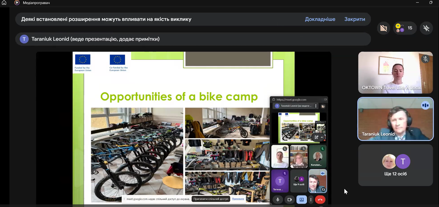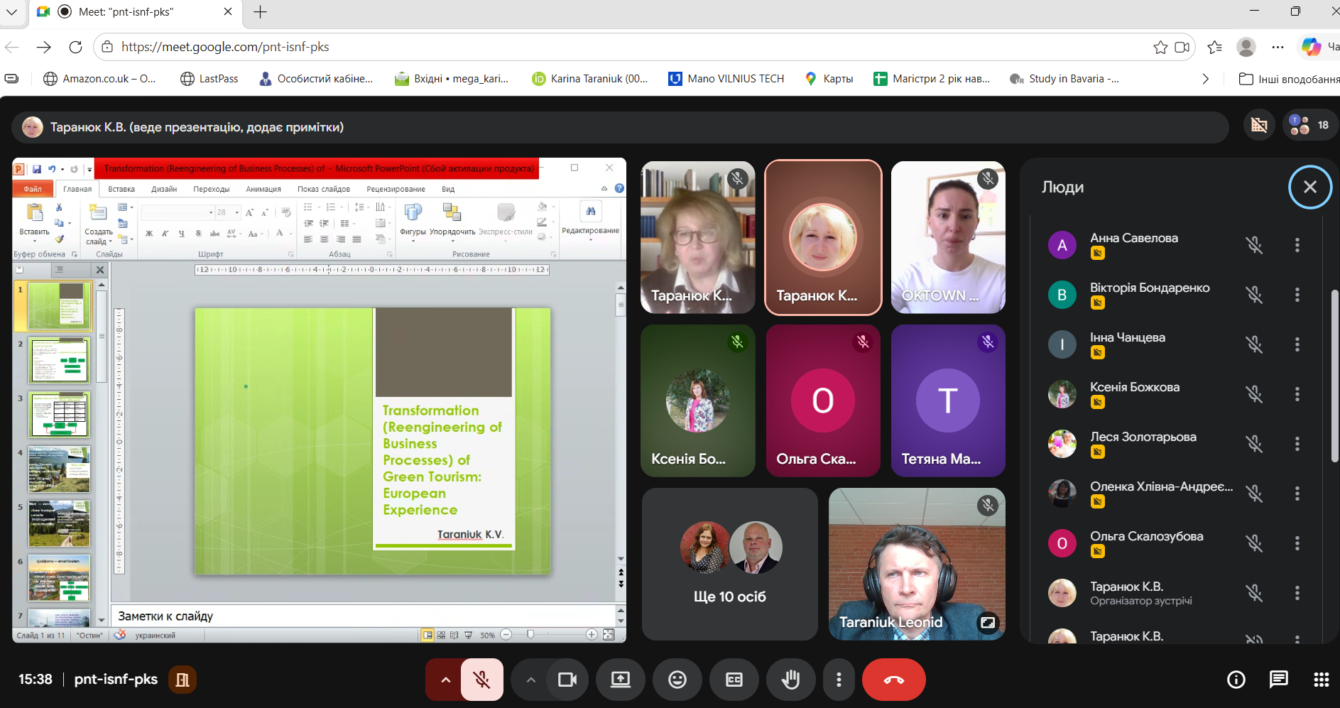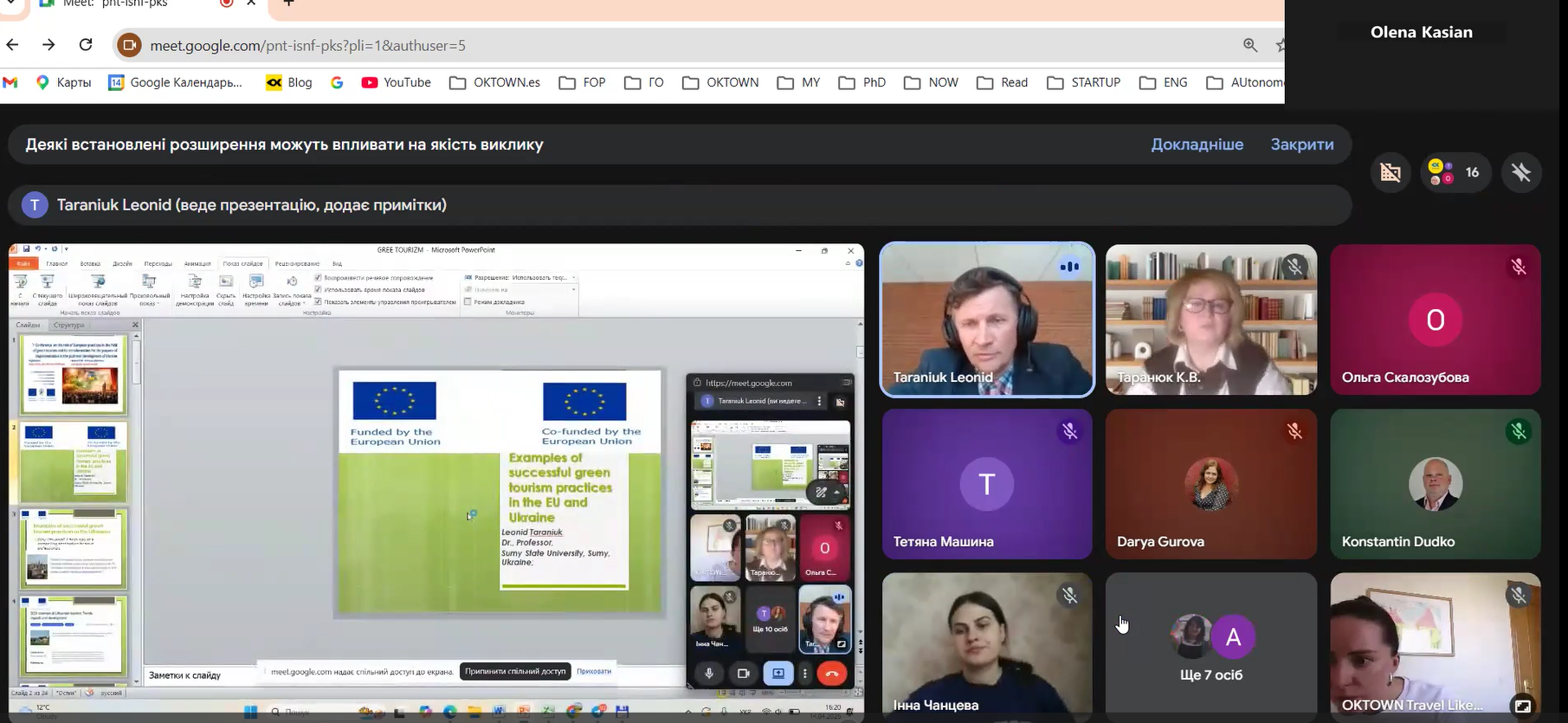 В конференції взяли участь представники робочої групи проекту: Олена Касьян, CEO OK Town, Україна з доповіддю «Сталий розвиток малих туристичних підприємств в Іспанії: управлінські підходи та адаптаційний потенціал для України» ; Каріна Таранюк, к.е.н., доц. старший викладач кафедри управління Сумського державного університету з доповіддю: «Європейський досвід трансформації (реінжинірингу) бізнес-процесів зеленого туризму»; Леонід Таранюк, д.е.н., проф., професор кафедри міжнародних економічних відносин Сумського державного університету, науковий співробітник-стажист університету Вітовта Великого, Литва з доповіддю: «Приклади успішних практик зеленого туризму в Європейському Союзі та Україні» та запрошені гості Костянтин Дудко, виконавчий директор Deutsche Perspektive e.V., м.Дортмунд, Німеччина та інші представники таких установ і організацій України та ЕС: Енергійна Україна м. Київ; НУ «Запорізька політехніка»; НУ «Кременчуцький університет ім. М. Остроградського; Urban Reform, м. Вінниця; Великописарівська станція юних натуралістів Великописарівської селищної ради Сумської області; Львівський національний університет імені Івана Франка; ЦСУН, Німеччина; University of Padua, м. Падуя, Італія; Новоодеська міська рада; BVUFSFJ e.V., м. м.Дортмунд, Німеччина; Миргородська міська рада; Відділ культури та туризму Медвинської селищної ради с. Медвин; Бородянська селищна рада, с. Бородянка, Київська область; КНУВС м. Івано-Франківськ; AURM, м. Мурсія, Іспанія; Сумський державний університет. Після завершення доповідей відбулася жвава дискусія, щодо можливості імплементації Європейських практик зеленого туризму в повоєнну та післявоєнну відбудову туристичної галузі України. Було сформовано ряд пропозицій щодо даної імплементації.