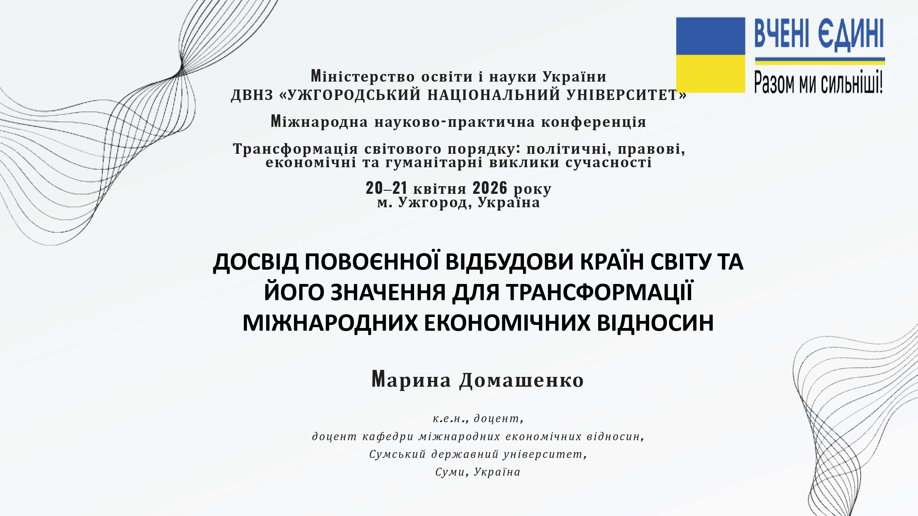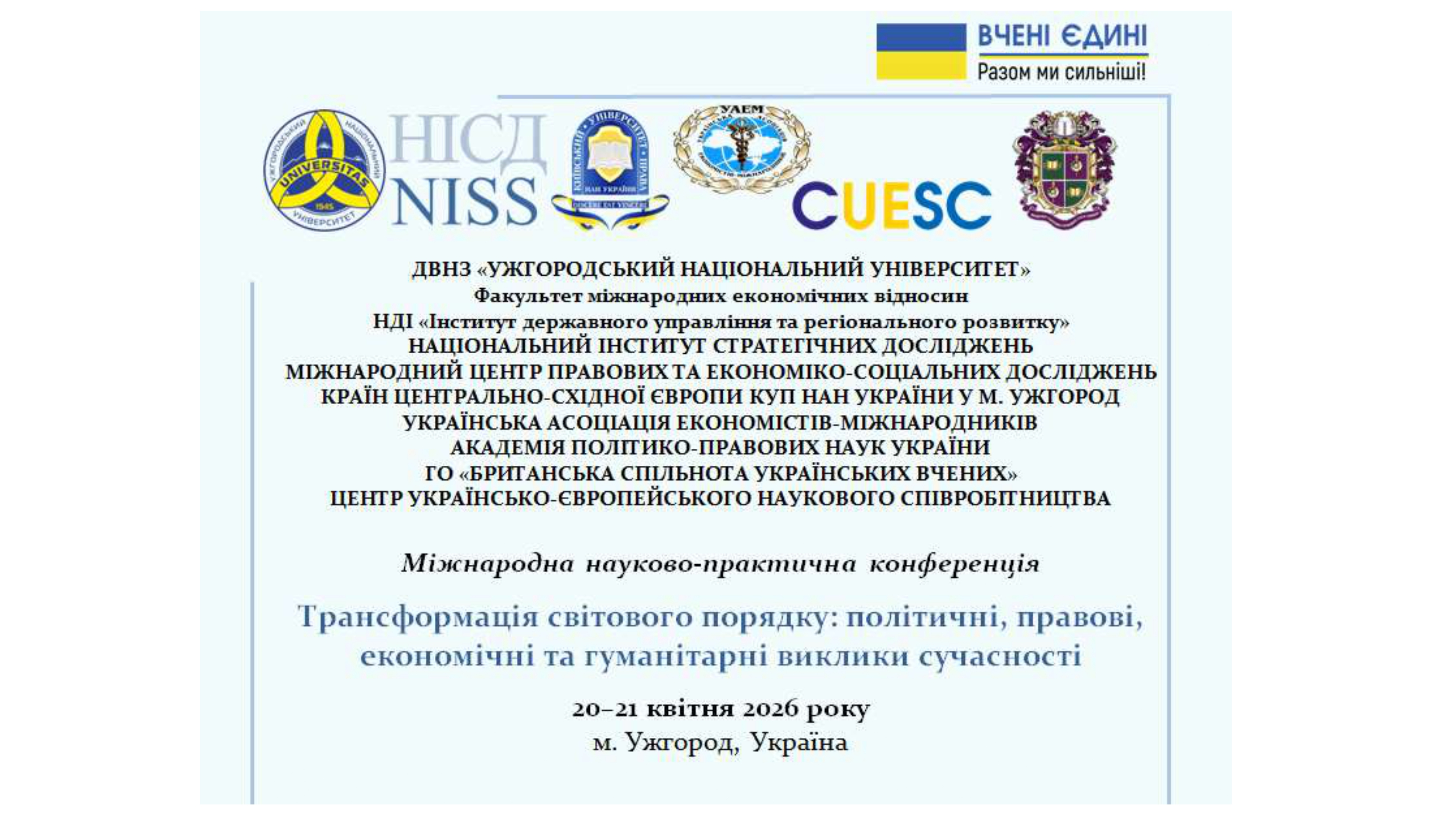 20 квітня 2026 року відбулася Міжнародна науково-практична конференція «Трансформація світового порядку: політичні, правові, економічні та гуманітарні виклики сучасності», організована на базі Ужгородського національного університету за участю провідних українських та міжнародних наукових установ.